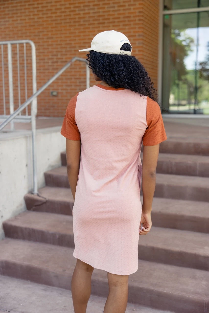 Behold…. the perfect throw on and go dress! No matter what you have on your daily to-do list this dress will be with you through it all. Featuring zippers on both sides, to make nursing a breeze. The comfortable, wrinkle-free material is stretchy and even has some subtle swiss dots throughout the body and sleeves of this dress. We just can’t get over the contrasting rust-colored sleeves and collar.